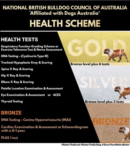 Recently all seven British Bulldog Clubs in Australia provided representatives to form a health committee and implement a health scheme for the breed. The health scheme has been accepted by the National British Bulldog Council and Dogs Australia.